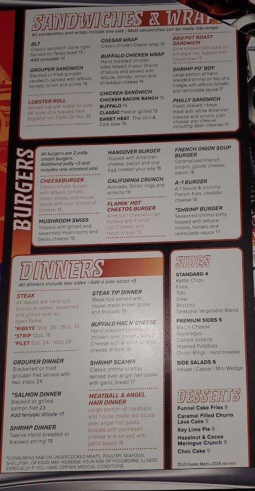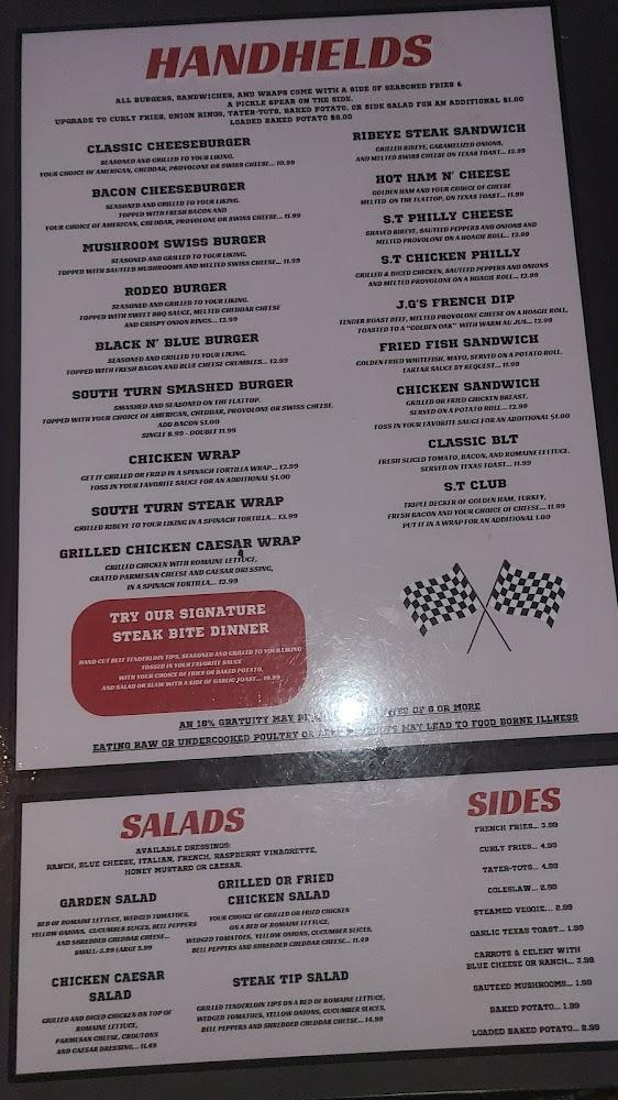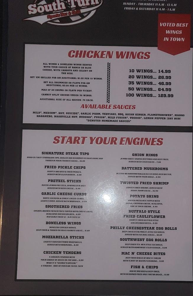 The menu at South Turn Lounge & Restaurant offers a wide variety of dishes and snacks. The starters are perfect for sharing or a quick bite, featuring options like calamari rings and fried mushrooms. Wings take center stage, with numerous sauces and cooking styles. The burger selection is impressive, featuring favorites like the cheeseburger and Flamin' Hot Cheetos burger. Salads and wraps cater to lighter fare, while dinner entrees like shrimp scampi and Grouper dinner deliver hearty portions.